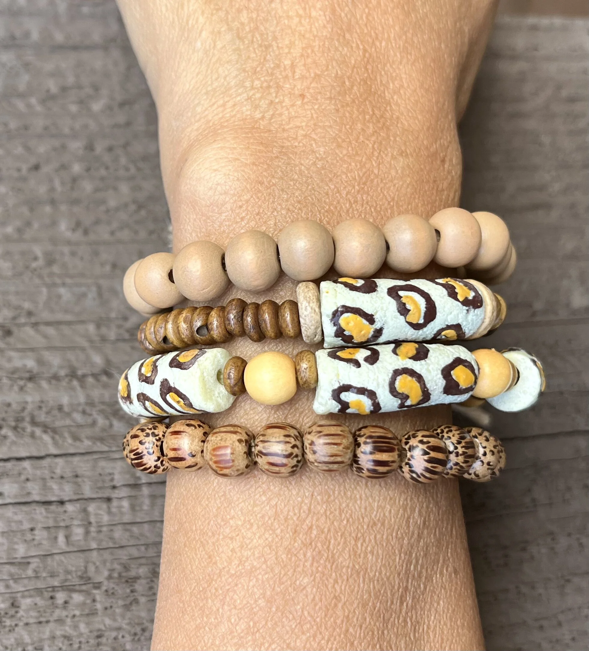 Image 1 of 1 The Savannah Stack $38.00 Sold Out Bracelet stack made with handcrafted African cheetah beads. Sold Out Added! Bracelet stack made with handcrafted African cheetah beads.