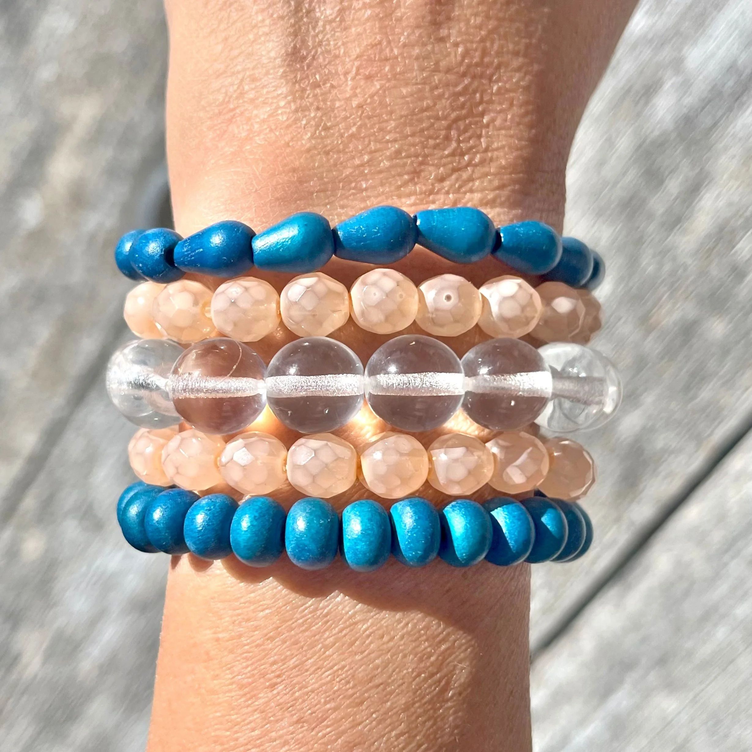 Image 1 of 1 The Martha's Vineyard Stack $38.00 Sold Out Clear glass, blue wood and peach glass beads. Sold Out Added! Clear glass, blue wood and peach glass beads.
