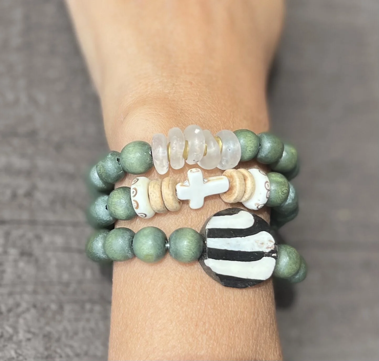 Image 1 of 1 The Burlington Stack $32.00 Green bracelet stack made with African glass and batik beads. Purchase Added! Green bracelet stack made with African glass and batik beads.