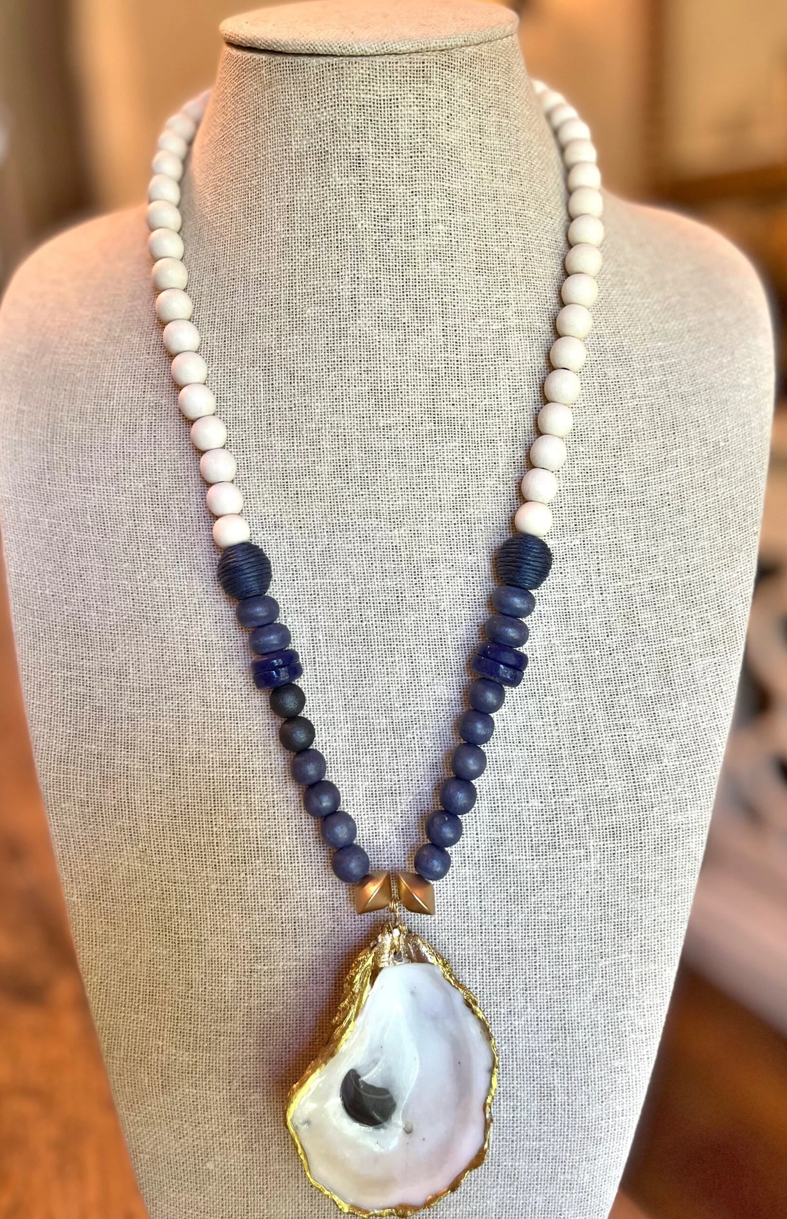 Image 1 of 1 The Carole $62.00 Sold Out Navy and gold oyster shell necklace. Measures approximately 24” plus oyster. Sold Out Added! Navy and gold oyster shell necklace. Measures approximately 24” plus oyster.