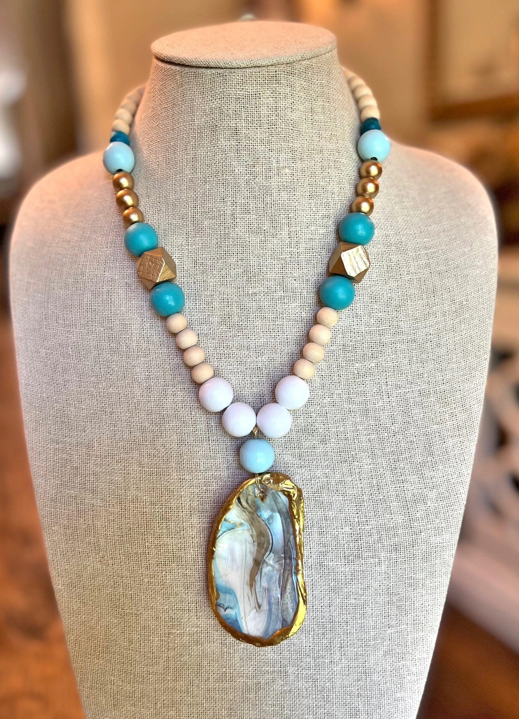 Image 1 of 1 The Kiley $62.00 Sold Out Blue and white marble oyster shell necklace. Measures approximately 21” plus oyster. Sold Out Added! Blue and white marble oyster shell necklace. Measures approximately 21” plus oyster.